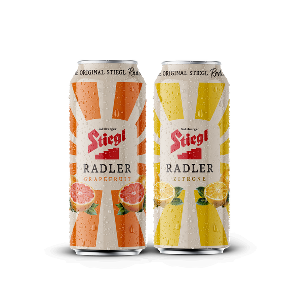 A full 12 pack of 500ml Radler cans from Stiegl Brewing featuring;